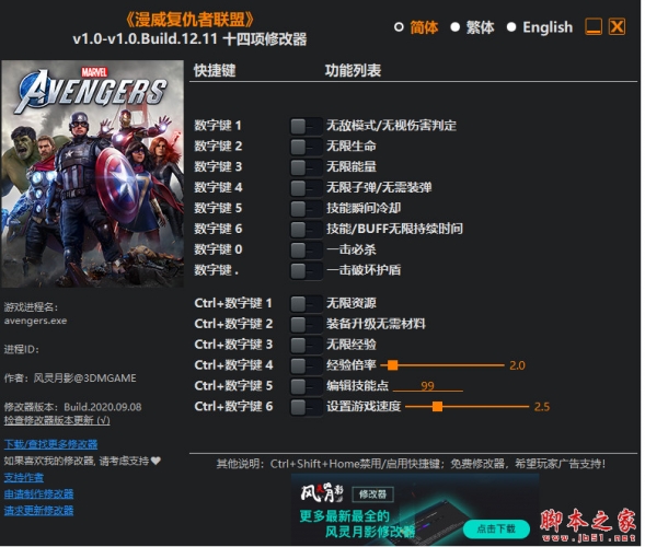 漫威复仇者联盟十四项修改器是一款针对同名游戏漫威复仇者联盟推出的功能修改软件,具有无限资源、装备升级无需材料、无限经验、经验倍率、编辑技能点、设置游戏速度等十四项功能,感兴趣的玩家快来下载体验吧。